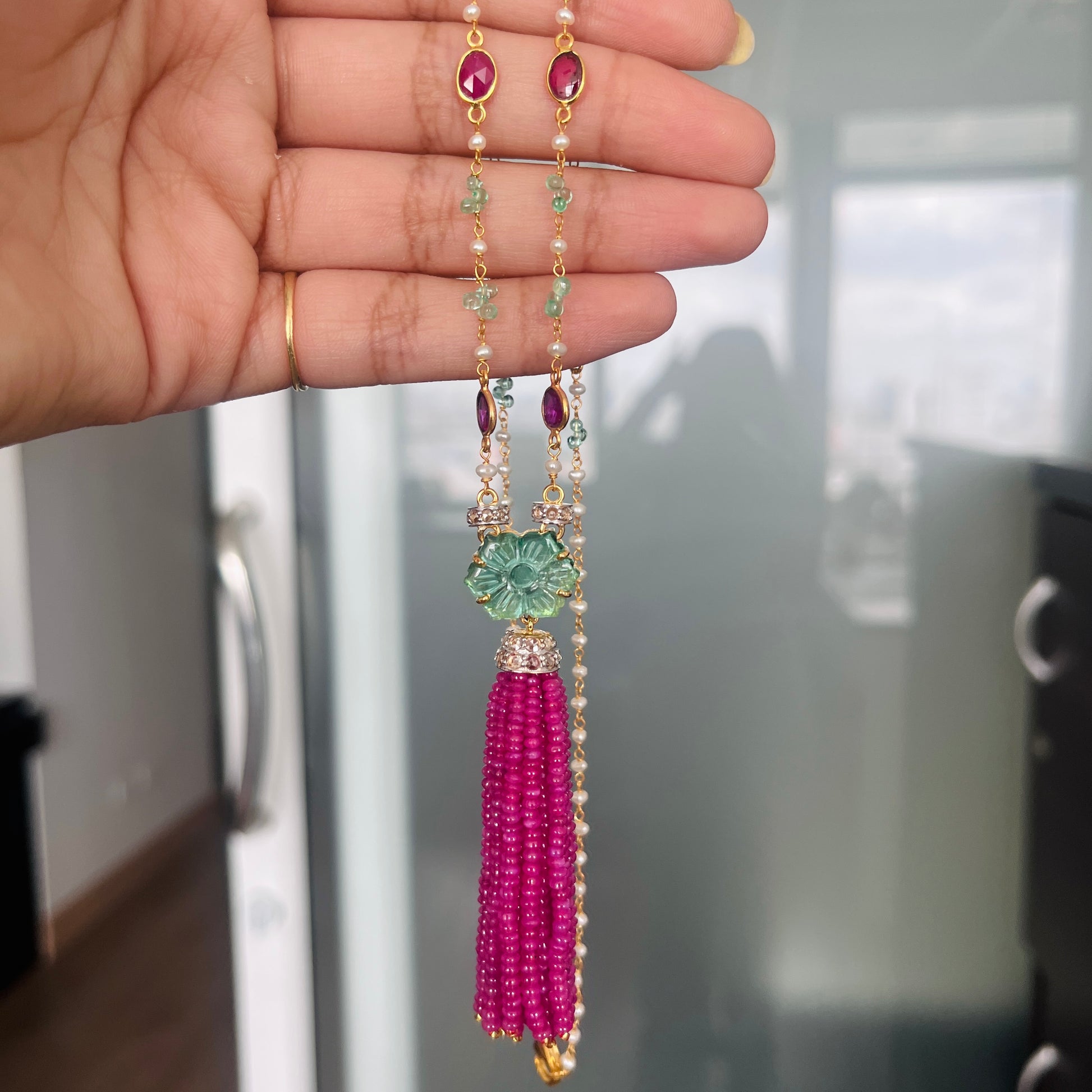Make a bold statement with this handcrafted 14K yellow gold tassel necklace, featuring intricate emerald carvings, Colombian emerald, ruby, and pearls, accented with natural rose cut diamonds. Perfect for special occasions or as a luxurious gift for her.