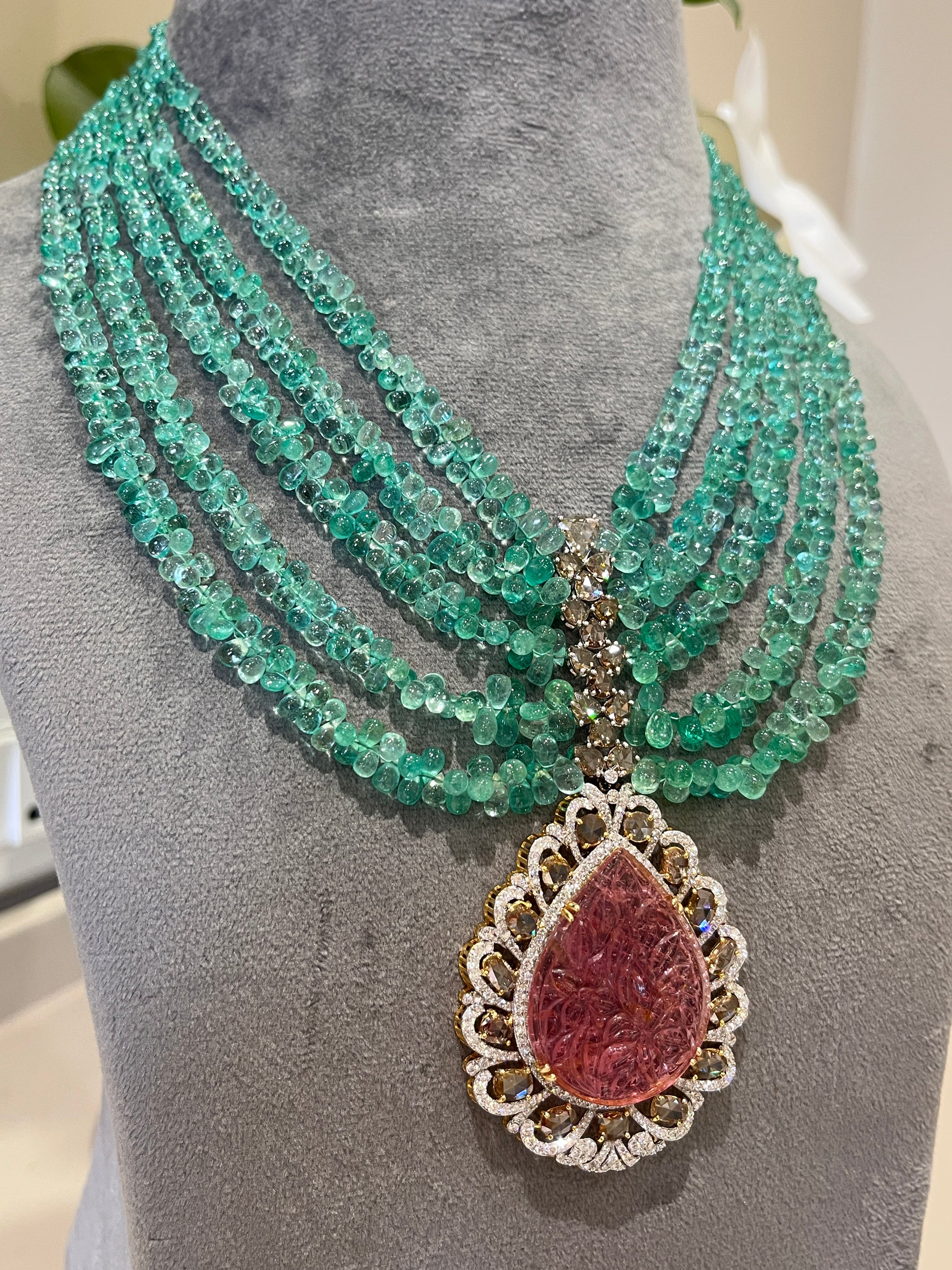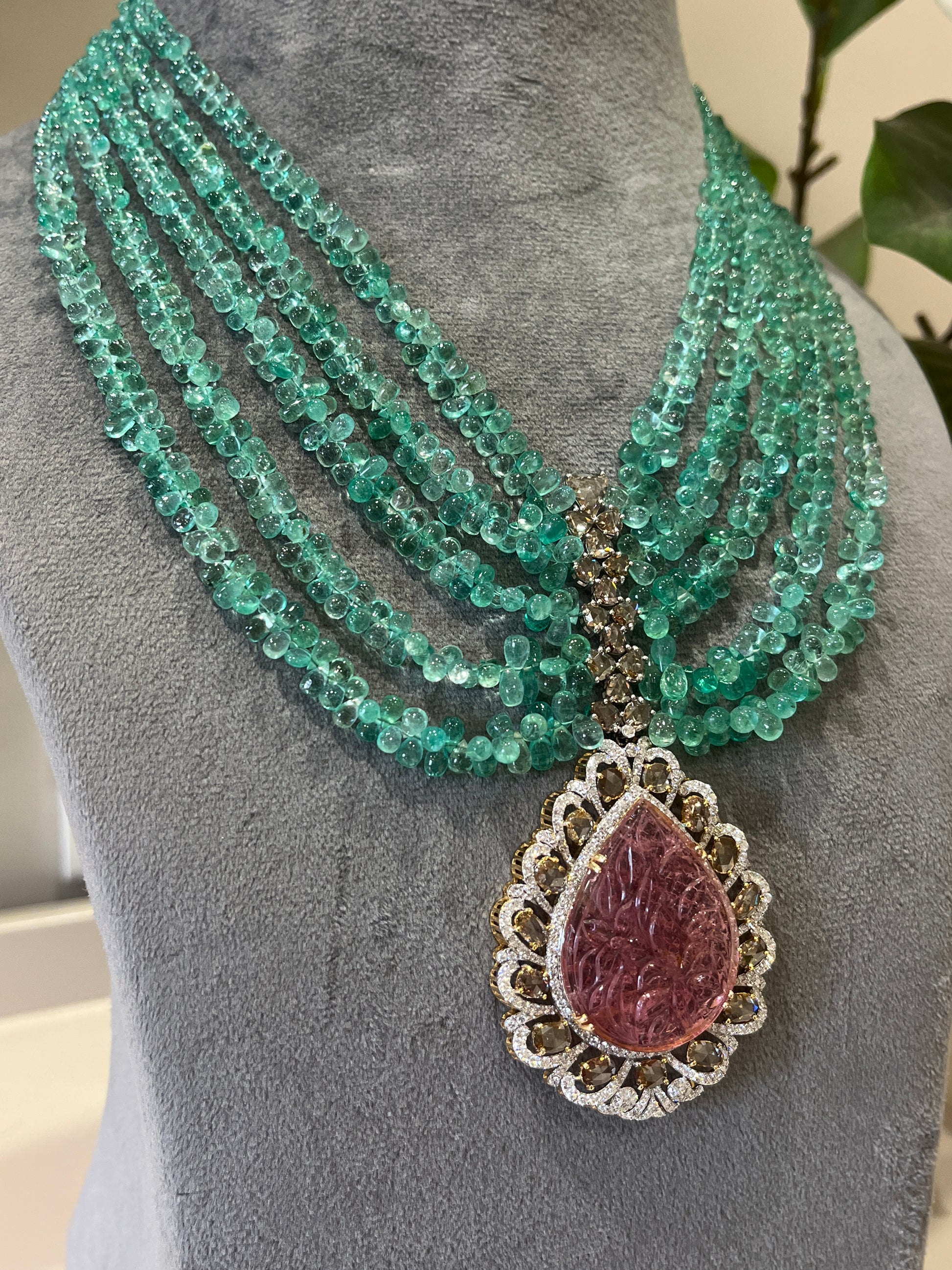 14K Gold Colombian Emerald, Tourmaline & Diamond Beaded Necklace
