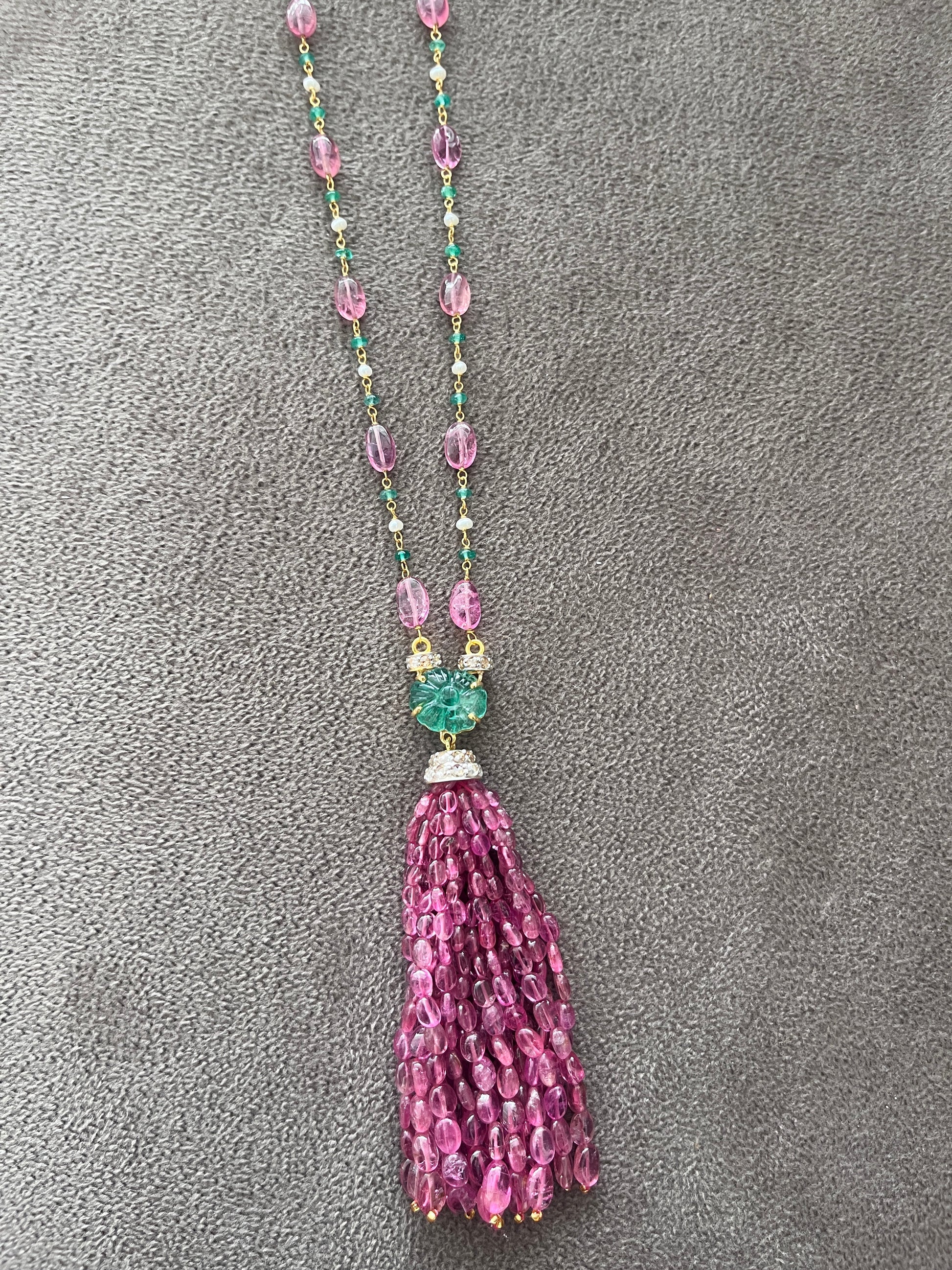 Turn heads with this handcrafted 14K yellow gold tassel necklace, featuring delicate emerald carvings, emerald, pink tourmaline, and pearls, accented with natural rose cut diamonds. A perfect statement piece for special occasions or a luxurious gift for her.