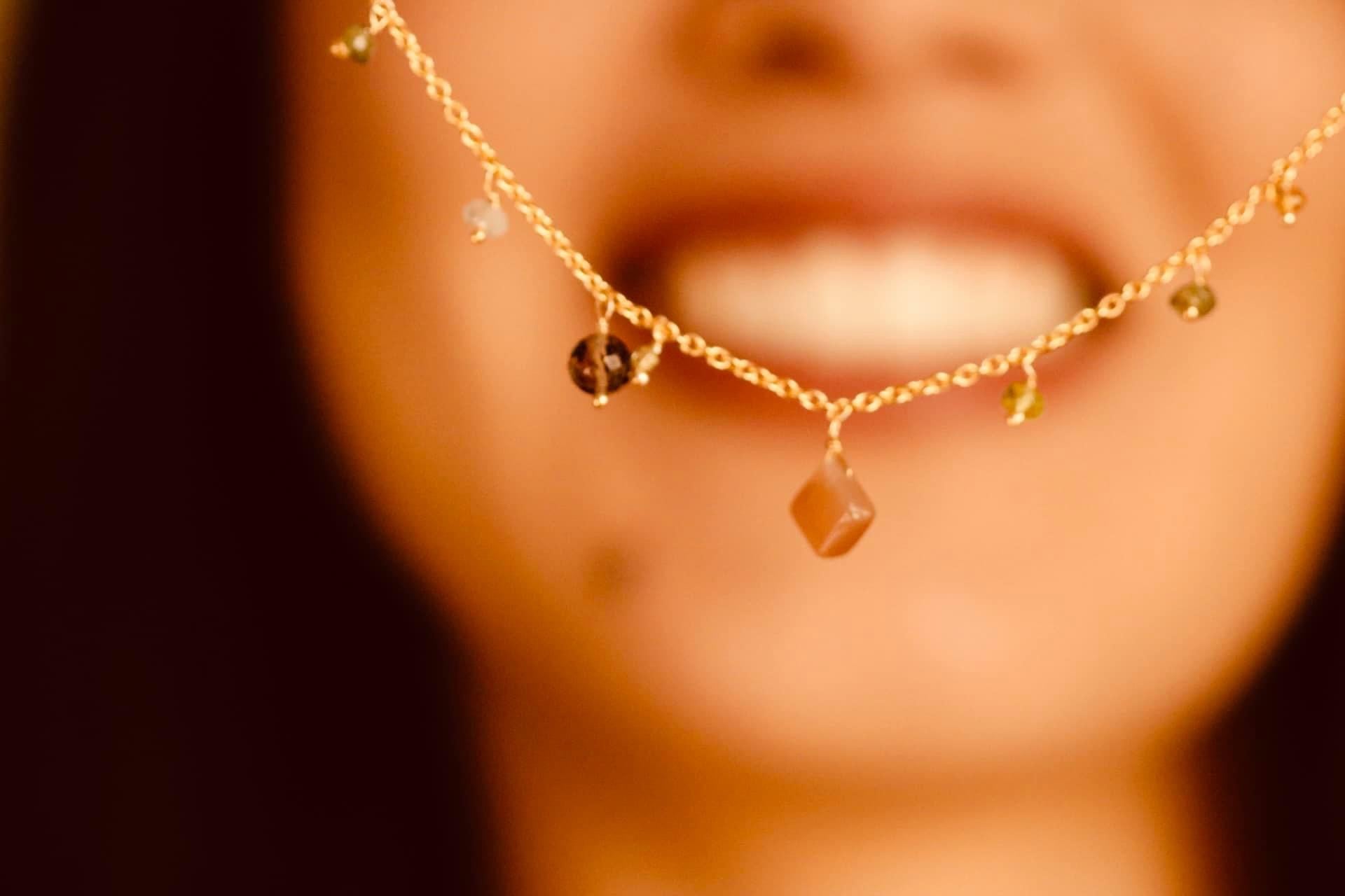 This stunning sunstone necklace brings together a vibrant mix of natural gemstones, allowing you to carry a piece of nature’s untouched beauty wherever you go. Featuring sunstone, peridot, smoky quartz, rainbow moonstone, green apatite, tourmaline, and citrine, each gem is carefully selected for its color and energy. The 18K gold-plated sterling silver adds warmth and elegance, making this necklace a versatile statement piece.